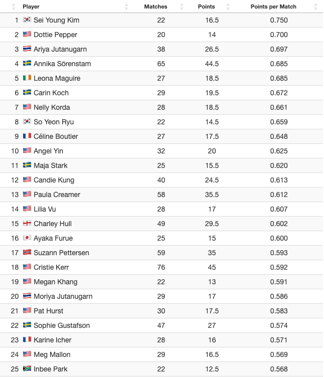 Who is the best match play golfer in the Match Play World Golf Rankings? We review the top men match play rankings and women match play rankings for professional golfers for match play golf. This covers every official professional event in the last 40 years, plus every Ryder Cup since 1927 and the USPGA Match Play since 1916. The golf rankings show players with a minimum 20 games and include singles, foursomes and four-ball golf formats.